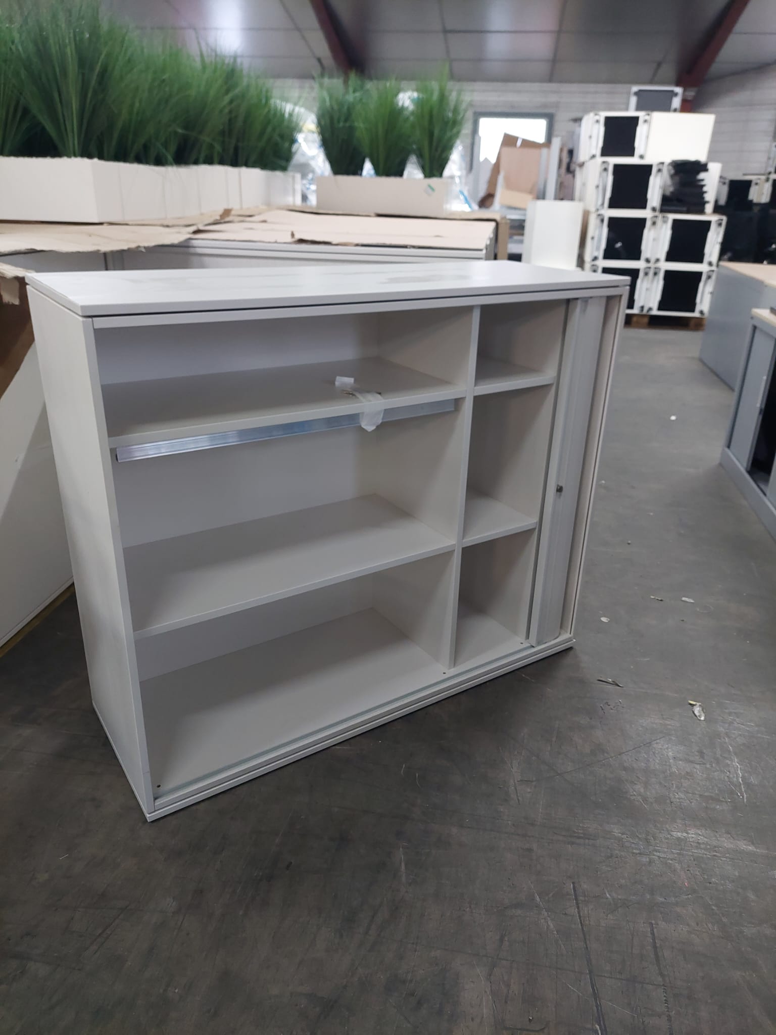 • Armoire basse blanche monorideau avec séparateur centrale de 6 niches