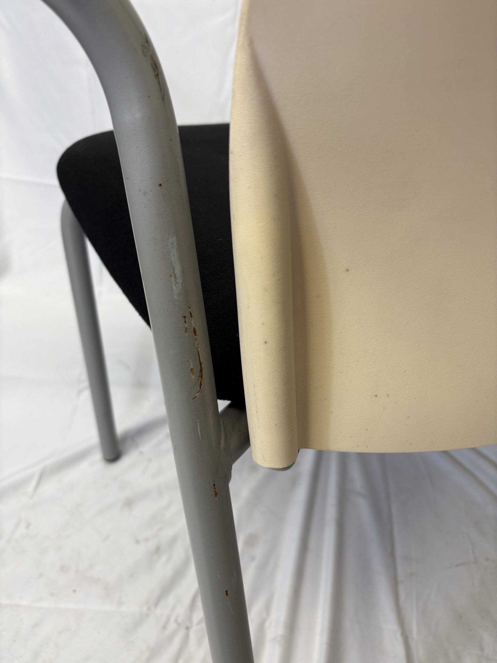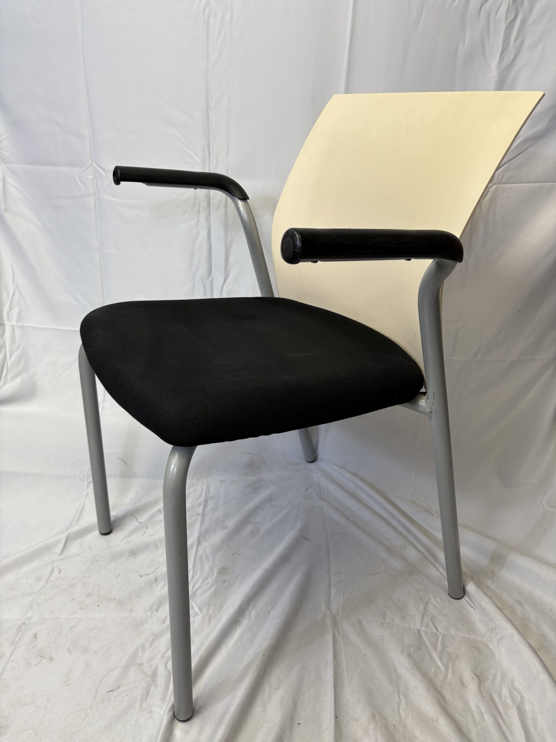 Chaise assise tissu noir et dossier PVC beige avec accoudoirs noir et piètement 4 pieds gris