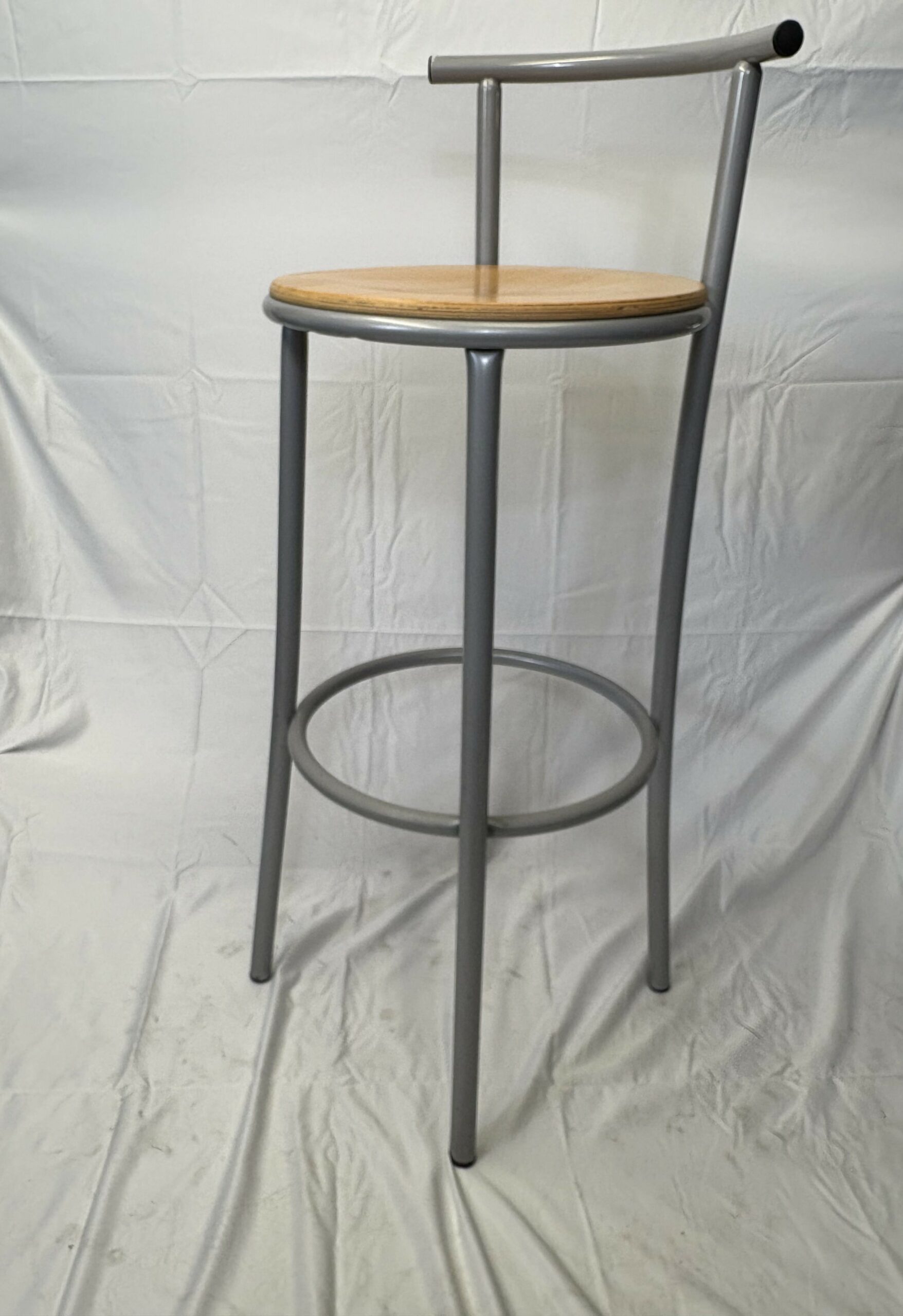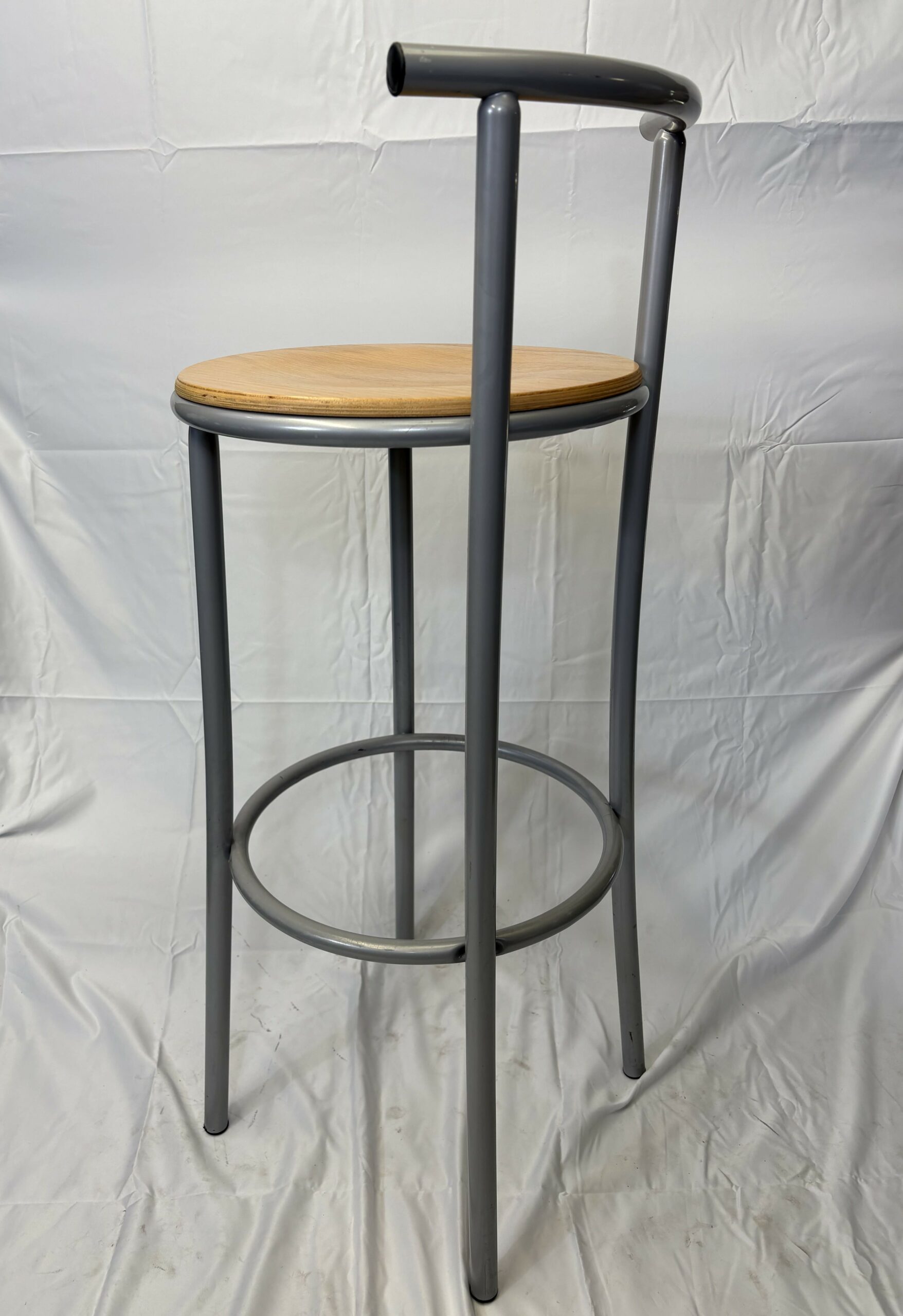 Tabouret assise bois et piétement gris métal, type bistrot avec repose pied gris